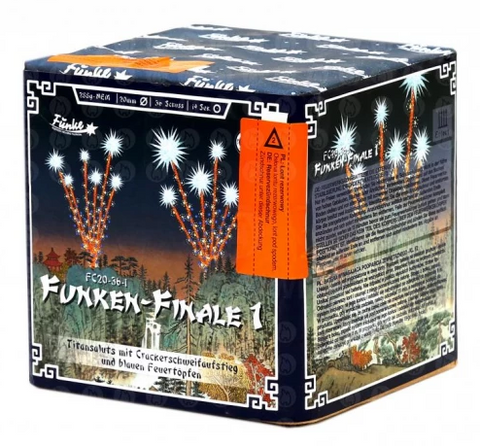 Funken Finale 1 is a 36 Shots - 20mm bore cake with deep blue mines with gold crackling tails rising to a great hight with titanium-salutes