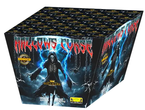 Hallow Curse - Unleash spine-tingling thrills this Halloween with Hallows Curse, the terrifyingly spectacular 32-shot barrage from Hallmark Fireworks. With a mighty 480.1g of NEC, this powerful firework delivers an unforgettable display of color, noise, and pure pyrotechnic magic.