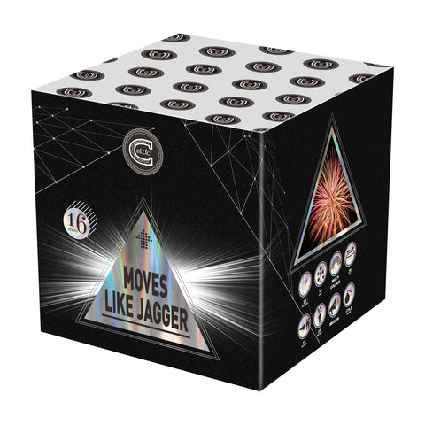 Moves like Jagger is a dynamic 16-shot firework with a 25mm bore, designed to ignite the night sky with a burst of vibrant energy. Each shot transforms into a stunning display of red, green, yellow, and blue stars, painting the sky with a brilliant array of colours. What sets this firework apart is the mesmerizing choreography of silver darting tails, gracefully moving in various directions, creating a captivating dance of light and motion. With its lively and engaging performance, Moves like Jagger will leave spectators enthralled, providing a visually stunning and memorable fireworks experience.