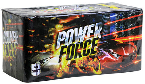 POWER FORCE IS A 40 SHOT CAKE EJECTING EITHER WHISTLE COMETS, GREEN OR SILVER TAILS THAT BURST WITH EITHER RED STAR & SILVER STROBE EFFECTS, BLUE STARS & CRACKLE EFFECTS, RED