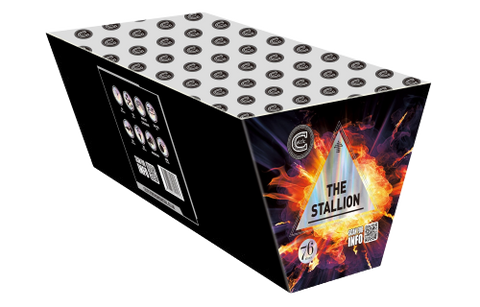 The Stallion is a 76-shot fanned firework with 662 grams of gunpowder, making it a true thoroughbred from its 20/25mm bore tubes. It sweeps from left to right and back, each big bust displaying an array of colors and shimmering stars, then to a fan effect which features beautifully bright colored stars and brocades filling the sky.