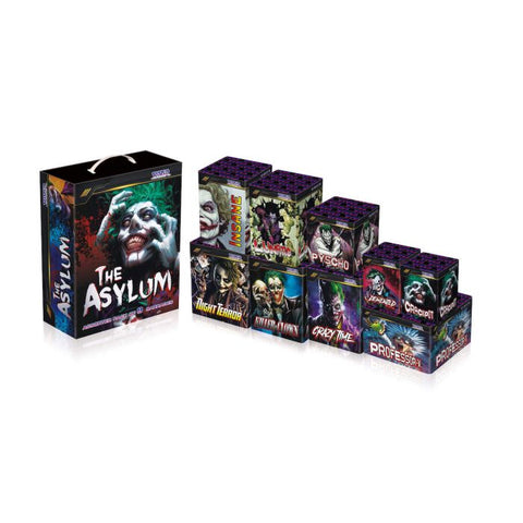 The Asylum display pack contains 9 assorted cakes with multiple effects that boast great colours, crackles, strobes and loud reports.