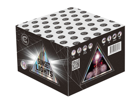 Sunset Lights by Celtic Fireworks has 64 shots of coloured strobes with wave bursts leading into coloured tails and beautiful golden bursts.
