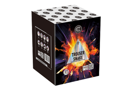 Trouser Snake is a 25 shot - 30mm tube cake - 500g of gun powder with Vibrant gold snakes in brownian motion with bright blue stars