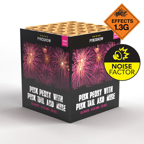 Pink Peony with Pink Tail and Mine is brilliant big bore barrage at 25mm fires 25 shots of vivid purple pink mines to bright purple pink peony breaks with a duration of 20 seconds.