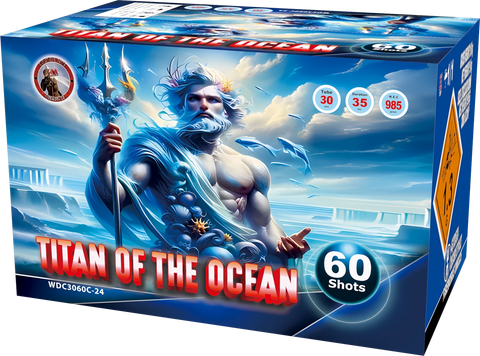 Titan Of The Ocean is a spectacular 60 shot - 30mm bore, vertical firing single ignition firework from Caractacus Potts Fireworks. Titans starts with a flurry of blue and red stars to crackling bouquet mines with bursts of deep blue stars with dirty gold brocade spit horsetail pistils. Followed by gold brocade tails with blue tips to blue stars and deep gold serpents. Followed with blue tails to volleyed bursts of gold horsetails with green glitter tips before a final volley of blue to gold chrysanthemum crackle.