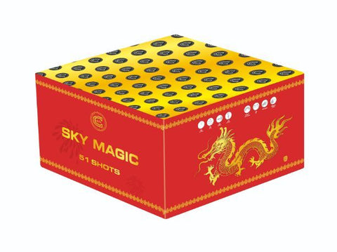 Sky Magic is a 51 Shot cake. Red tails to spit red strobe stars, green tail to spit green strobe stars and blue tail to spit orange strobe stars. Firing vertically then in a V formation before Z firing with a spit white strobe and finishing with a lift of spit red strobe.
