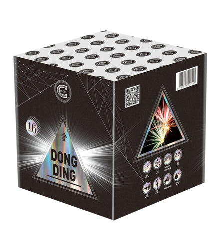 Small firework, but don't let that put you off it produces some amazing effects! Dong ding fires 16 shots of silver spiraling comets which burst loudly into various coloured peonies.