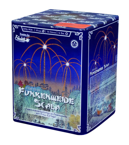 Scala is a Stunning 25x30mm shot barrage with golden tail lift and at it's peak it bursts with a titanium salute with a stunning thick golden brocade willows that hang in the air and fall gracefully back down. Absolutely huge effects that will leave you mesmerized.