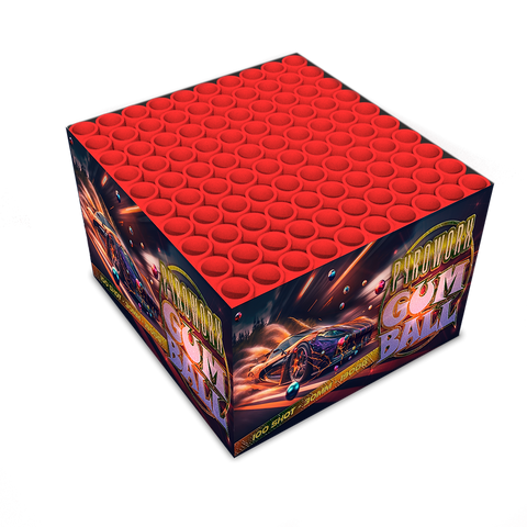 Gumball is a100shot compound - 30mm firework with 1900g of powder. This has all the glitz and glamour and drama of the legendary race it's named after. Mine lifts with thick golden tails to huge palms with red, blue and pink stars with yellow tail stars into a MASSIVE ending of loud crackling cluster.