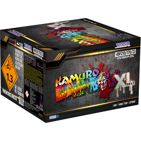 Kamuro Rainbow XL is 100 shots x 30mm bore firework with stunning white tails to Kamuro breaks with Red, Lemon, Purple & Blue stars with matching mines in just 45 seconds, Kamuro Rainbow is definitely one outstanding firework.