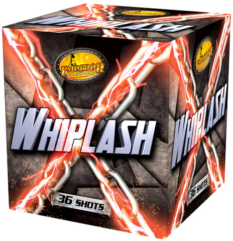 Whiplash has 6 Shots each of Red shots bursting into Red Tipped silver Coconuts; Green shots exploding to golden coconuts with green strobes; Red Shots breaking into Brocade Crown with Red Pearls; Green Shots bursting into Brocade Crown with Green Pearls; Red Shots breaking into Red Tipped Crackling Coconuts and a Finale Volley of Red Shots exploding into Red and Green Tipped Coconuts and Crackling Chrysanthemums.