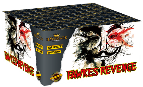 Fawkes Revenge - 100 x 25mm shots by Hallmark Fireworks is a multi angled, multi effect barrage that will stand out in any firework display. Starting with vertical golden brocades and strobes with a splash of colour followed by a fan of brocades and crackles to V firing crackling comets with coloured stars in-between and ending in a flurry of shots fired in pairs giving it that awesome firing sequence topped with loud reports.