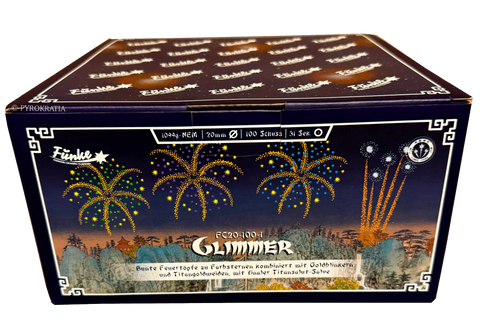 Glimmer 100 shot -20mm bore barrage with colourful mines to golden tails with coloured stars accompanied by gold strobe and gold willows with a rapid finale of loud titanium salutes.