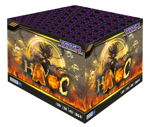 Havoc has 36 shots with Golden tails to big brocades tipped with strobes then changing colours and firing pattern.