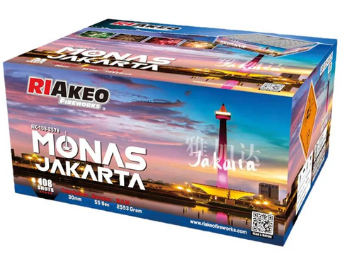 Monas Jakarta by Riakeo Fireworks is a powerful F3 compound with 108 shots of 30mm calibre effects and 2553g powder weight. Firing in rapid succession, it produces thick gold comet tails, blue horsetails, silver strobes, golden brocades, and unique angled V and Z firing patterns with colourful comets.