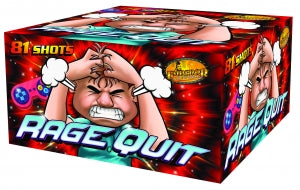 Rage Quit is a 81 shot x 20mm barrage with red tail into brocade crown with red stars. Green tail into brocade crown with green stars. Blue tail blast brocade crown with blue stars. Silver whirl with white strobe. Finale of brocade crowns and crackling chrysanthemums.