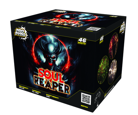Soul Reaper is a great 46 shot barrage. Summons a hauntingly beautiful display of titanium willows, brocade crowns, and vivid swimming stars. With eerie trails of red and green glitter, bursts of blue-tipped willows, and mesmerising colour-changing effects, it delivers a powerful, spectral presence in the sky — both elegant and unforgiving