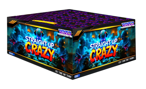 Straight up Crazy is total chaos! This powerhouse compound from Vivid Pyrotechnics delivers 100 rapid-fire shots of pure madness, packing 1200g NEC into 25mm tubes for a show that mine to blue stars and red strobes, brocades, big crowns with coloured tips ending in dragon eggs and crackling finale
