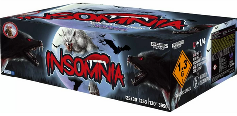 Insomnia by Vivid Pyrotechnics is spectacular compound firework which features 253 shots from 25mm and 30mm tubes, packed with 3950g of powder, and lasting 102 seconds. It begins with golden comet tails, golden palms, and strobing pearls, followed by red crossettes and shimmering horsetails. The display continues with golden comet tails, golden willows, and dahlias. It builds to a finale of orange-tipped comet tails, golden brocades, and a multi-shot of sizzling willows. "Insomnia" promises a stunning visual display to cap any celebration.