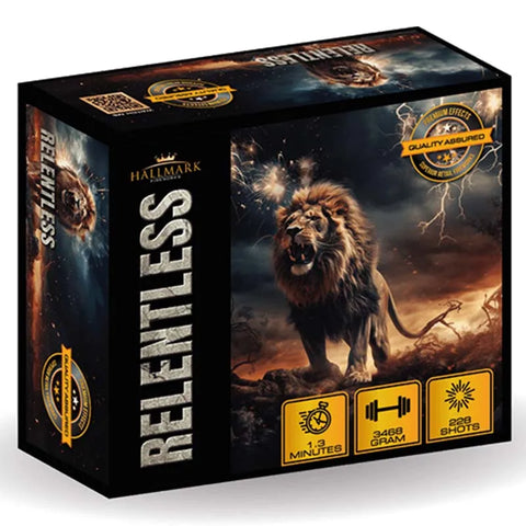 Relentless is a single Ignition compound firework that has 228 x 25mm shots by Hallmark Fireworks that doesn't let up from start to finish. Starting with a fantastic fanned mine lift to gold and blue stars to vertical star bursts followed by a fan of loud reports, crackling spiders, vivid coloured stars with crackles, mine lifts to brocades and continuing with more relentless barrage of shots into the sky. The noise from this is outstanding...