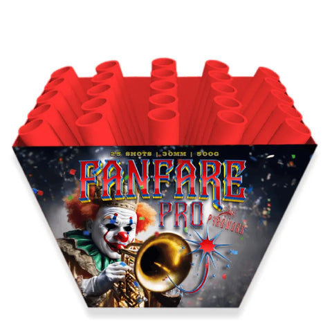 Fanfare Pro is a stunning fan shaped firework with 30mm bore tubes and 500g of gunpowder firing both from the ground and aerial effects which fill the sky with clouds of chrysanthemum bursts.